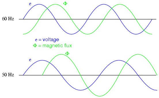 Another cause of abnormal transformer core saturation is operation at frequencies lower than normal. For example, if a power transformer designed to operate at 60 Hz is forced to operate at 50 Hz instead, the flux must reach greater peak levels than before in order to produce the same opposing voltage needed to balance against the source voltage. This is true even if the source voltage is the same as before. (Figure below)